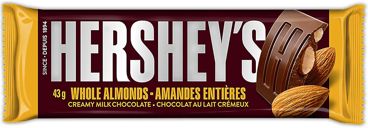 Hershey Almond Full Size Chocolatey Candy Bars, Individually Wrapped, 43g (Pack of 36 Candy Chocolate Bars)