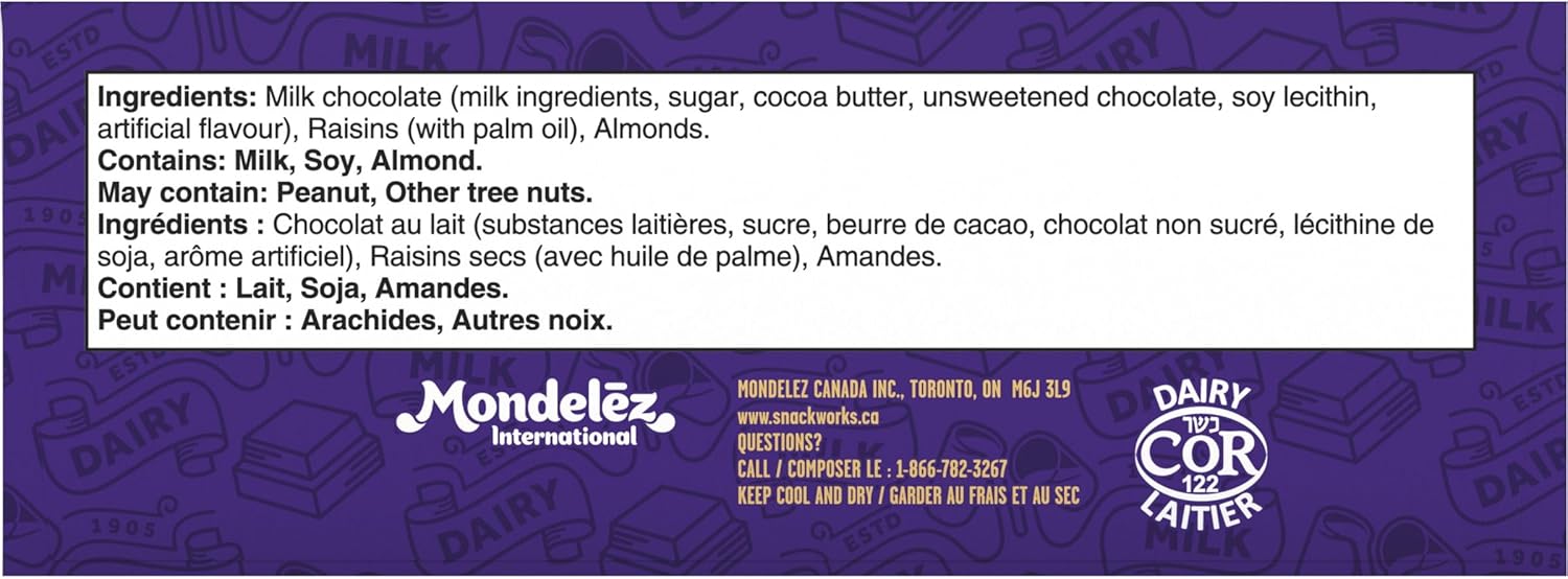 INGREDIENTS: Milk chocolate (milk ingredients, sugar, cocoa butter, unsweetened chocolate, soy lecithin, artificial flavour), Raisins (with palm oil), Almonds. Contains: Milk, Soy, Almond. May contain: Peanut, Other tree nuts.