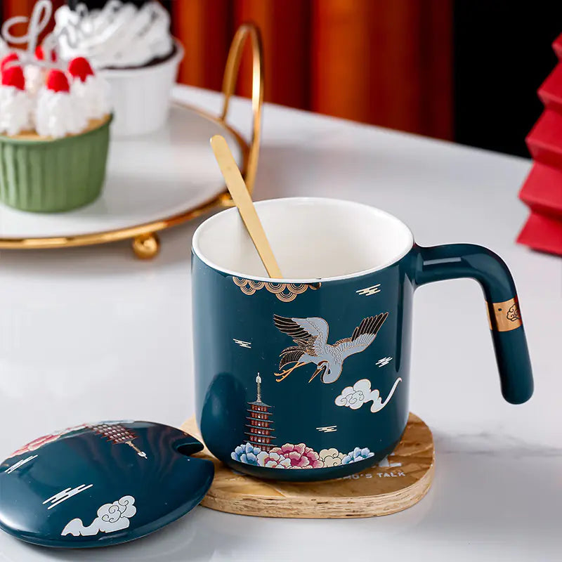 Introducing the perfect blend of style and practicality, our ceramic coffee cup with lid and spoon showcases an enchanting Chinese-style flower crane design, making it an ideal addition to both your home and office.