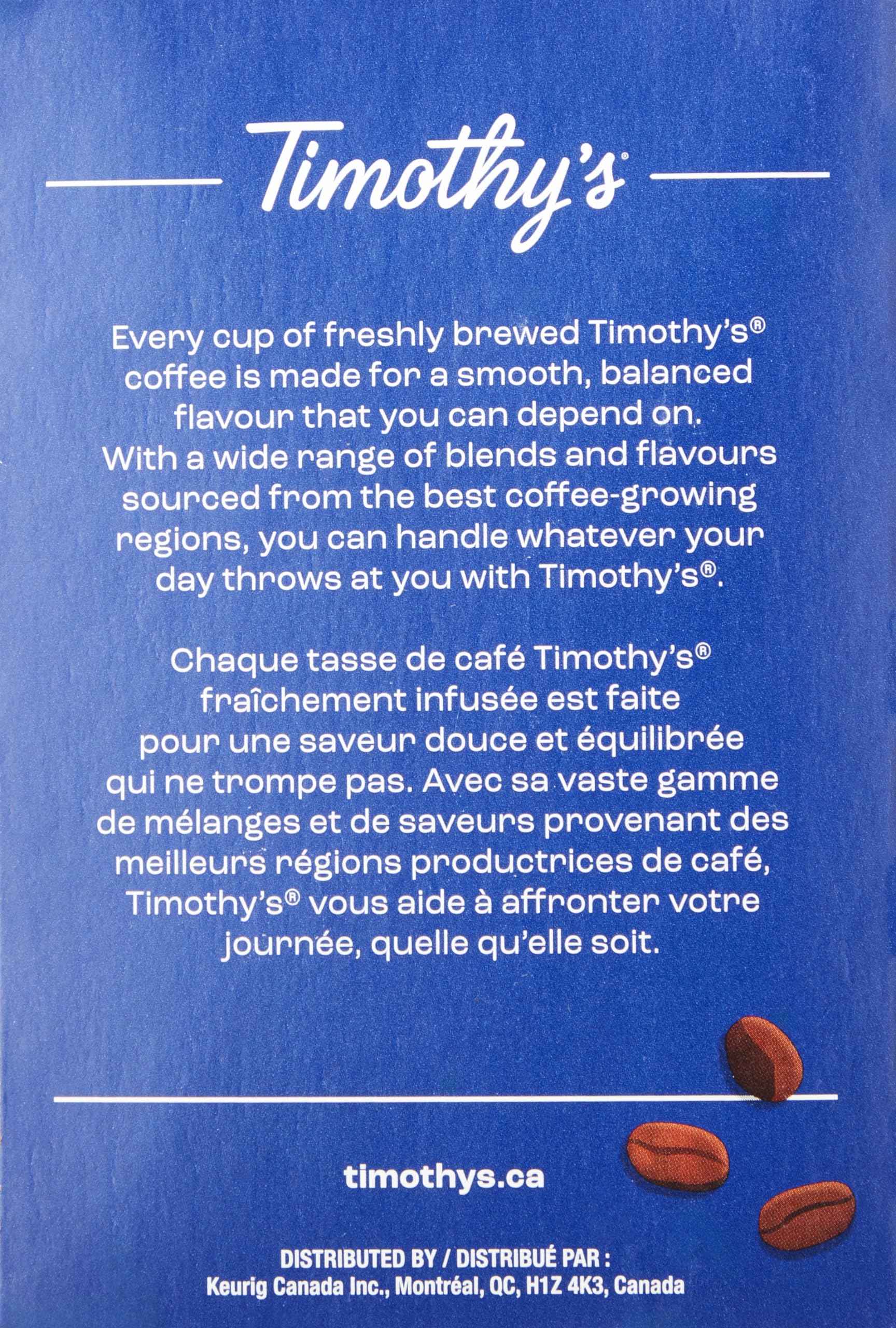 - Trusted Brand: Roasted by Timothy’s World Coffee, known for sustainable sourcing and expertly crafted flavor.