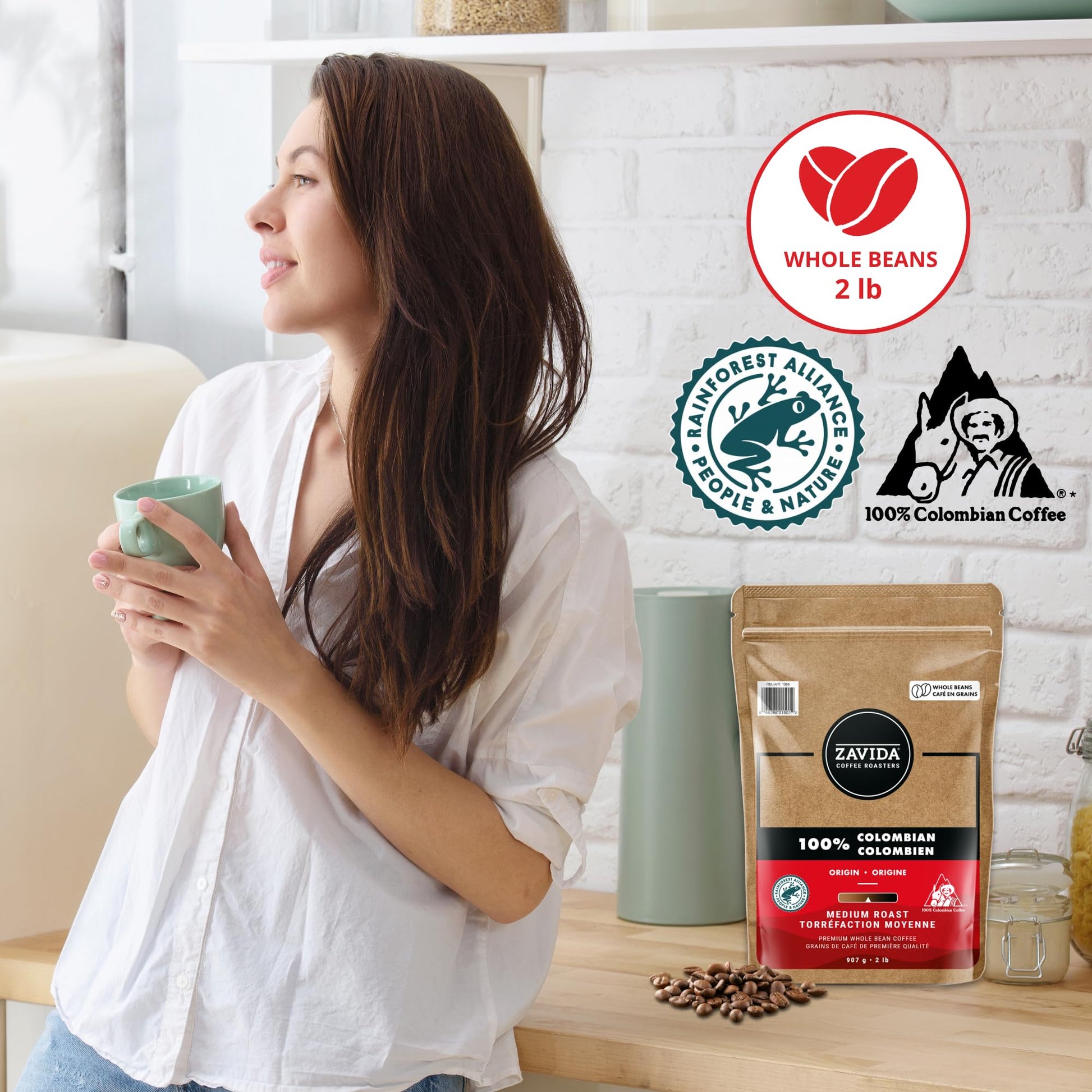 Zavida 100% Colombian Whole Bean Coffee – Medium Roast Arabica, 907g (2 lb)
